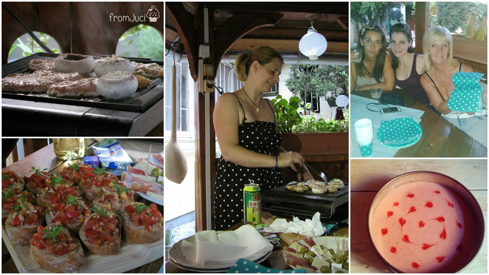 Mindenki készített valami finomságot. :) Alice barackos sütit, Eni készítette a grillezett ételeket (pácolt tarja, csirke és fűszervajon grillezett gomba), Anita pedig az előételért volt felelős, készített egy sonka - sajt - olivabogyós tálat plusz még hozzá bruschettát. Hát szégyen nem szégyen, én most ettem ilyet először és úgy gondoltam muszáj ezt valamelyik este beiktatnom, mivel a borokhoz nagyon jól passzol és egy filmnézős estéhez remek ötlet, sőt baráti összejövetelekhez is előételként kiváló.